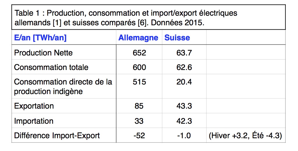 Les arguments donnés dans le résumé qui suit sont justifiés dans les deux sections suivantes. Les quantités d’énergie électrique sont données en Tera-Watt-heures (TWh). 1 TWh = 1 milliard de kWh. La Suisse produit et consomme approximativement 63 TWh/an.