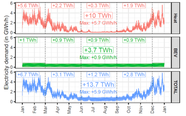 L’étude présente des analyses de sensibilité fouillées (par heure, jour, semaine, mois, trimestre et semestre saisonnier) pour les VEL (+3,7 TWh(él)) et pour les PAC (+10 TWh(él)) et pour l’ensemble (+13,7 TWh(él)) au long des douze mois de l’année (voir la figure en titre). Elle résulte en trois profils de demandes horaires (GWh/h, soit autant de GW). En hiver, la part des PAC est prépondérante, arrivant à une demande en puissance de 5,7 GW, en été la part des VEL est prépondérante avec 0,9 GW. L’analyse de sensibilité détaillée donne des extrêmes allant de 4,3 à 6,9 GW, avec une moyenne d’extrêmes de 5,9 GW. À noter que chaque demande d’eau chaude ayant 5 °C de plus correspond à une puissance de 0,5 GW supplémentaire !