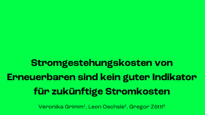 Lisez ici ce rapport de la WirtschaftsWoche (gratuitement) et jetez un coup d’œil à l’étude elle-même (ou à décharger ici : Stromgestehungskosten von Erneuerbaren sind kein guter Indikator für zukünftige Stromkosten, Veronika Grimm, Leon Oechsle, Gregor Zöttl, 19 pages, parue le 9 avril) !
