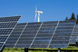 La centrale solaire photovoltaïque (PV) de 0,560 MW au Mont-Soleil – soit 4’575 m² de PV actifs sur un terrain de 20’000 m², inaugurée en 1992, avec une production de 0,550 GWh par an, soit un facteur de charge moyen de 11,21% – devant l’une des 16 éoliennes Vestas du parc Juvent de 37,2 MW au Mont-Crosin – actif dès 1996, avec une production de 70 GWh par an, soit un facteur de charge moyen de 21,48% ; les 8 premières machines avec de plus petites puissances ont toutes déjà été remplacées et complétées entre 2010 et 2016 par 12 machines de 2 MW et 4 de 3,3 MW. (*)